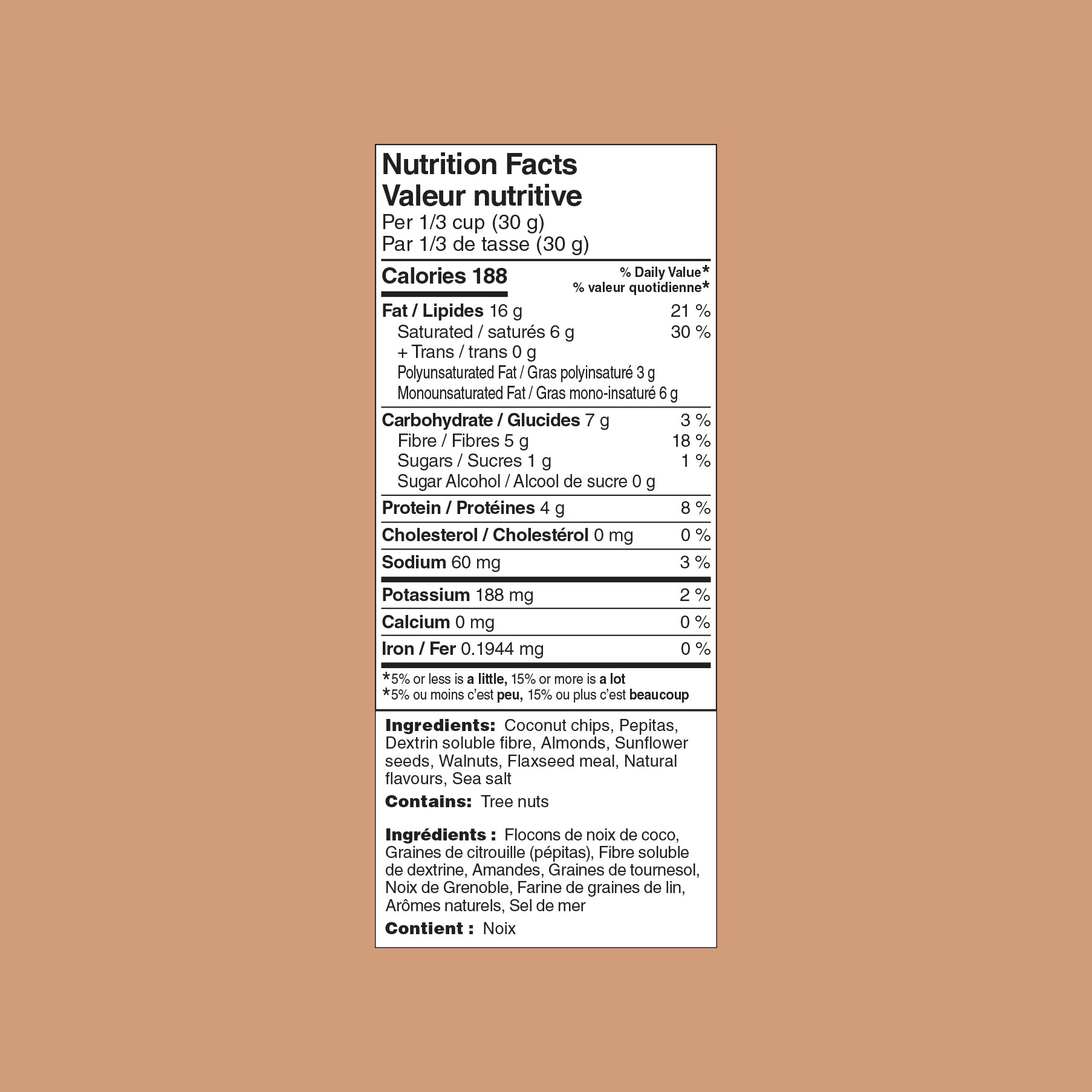 Chips de noix de coco, pépites, fibres solubles de dextrine, amandes, graines de tournesol, noix, farine de graines de lin, arômes naturels, sel de mer
